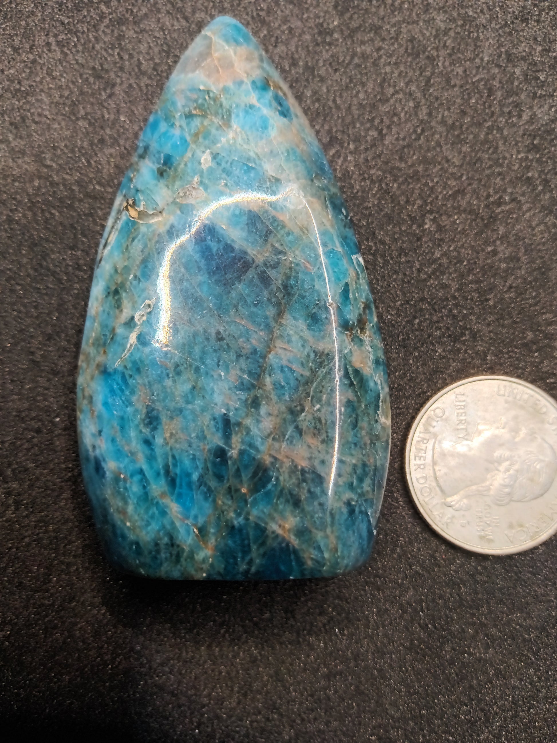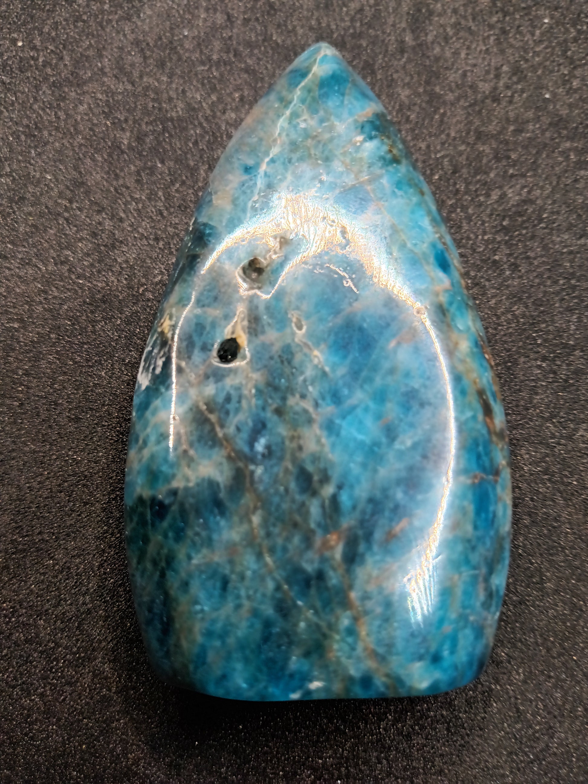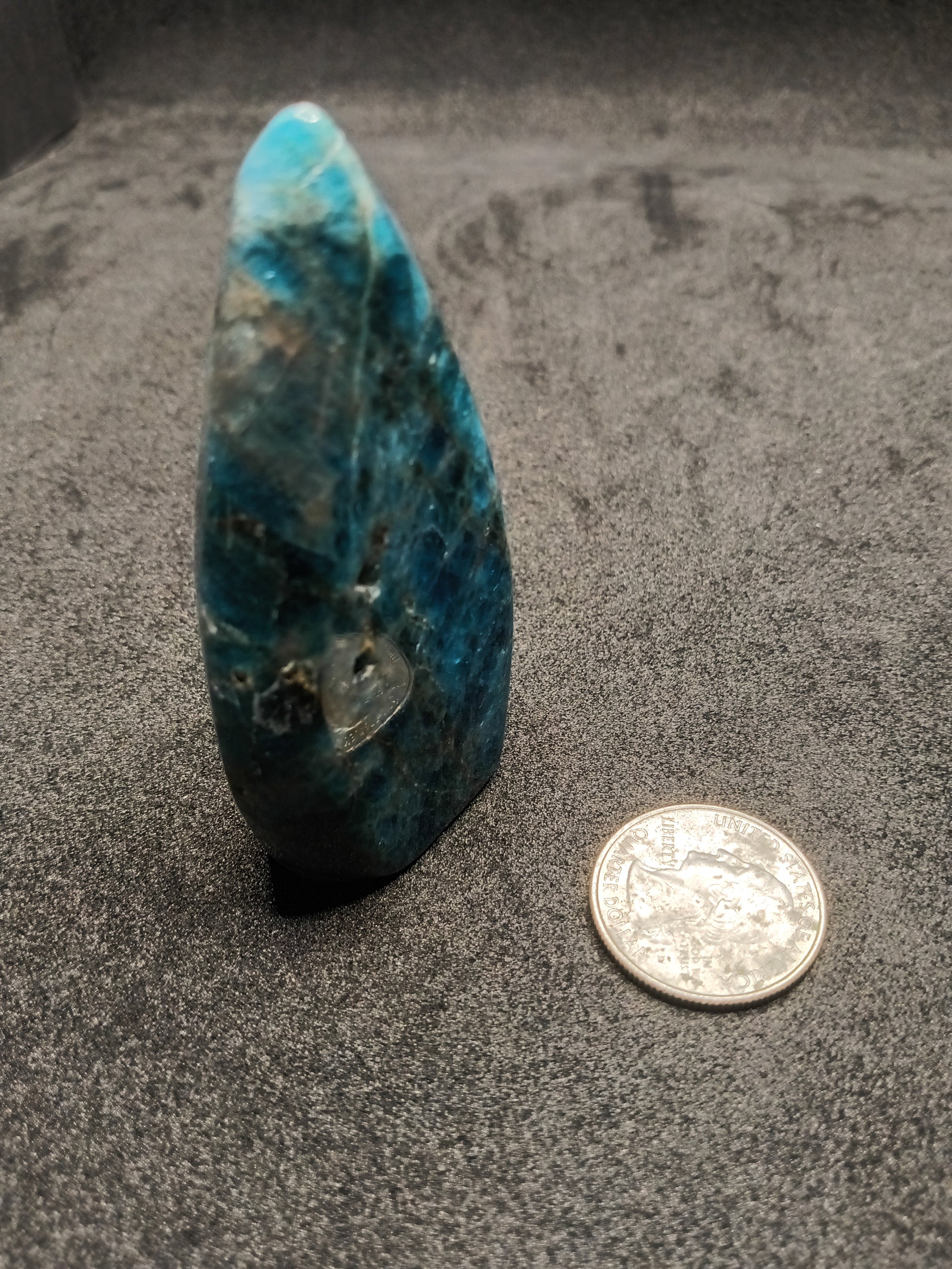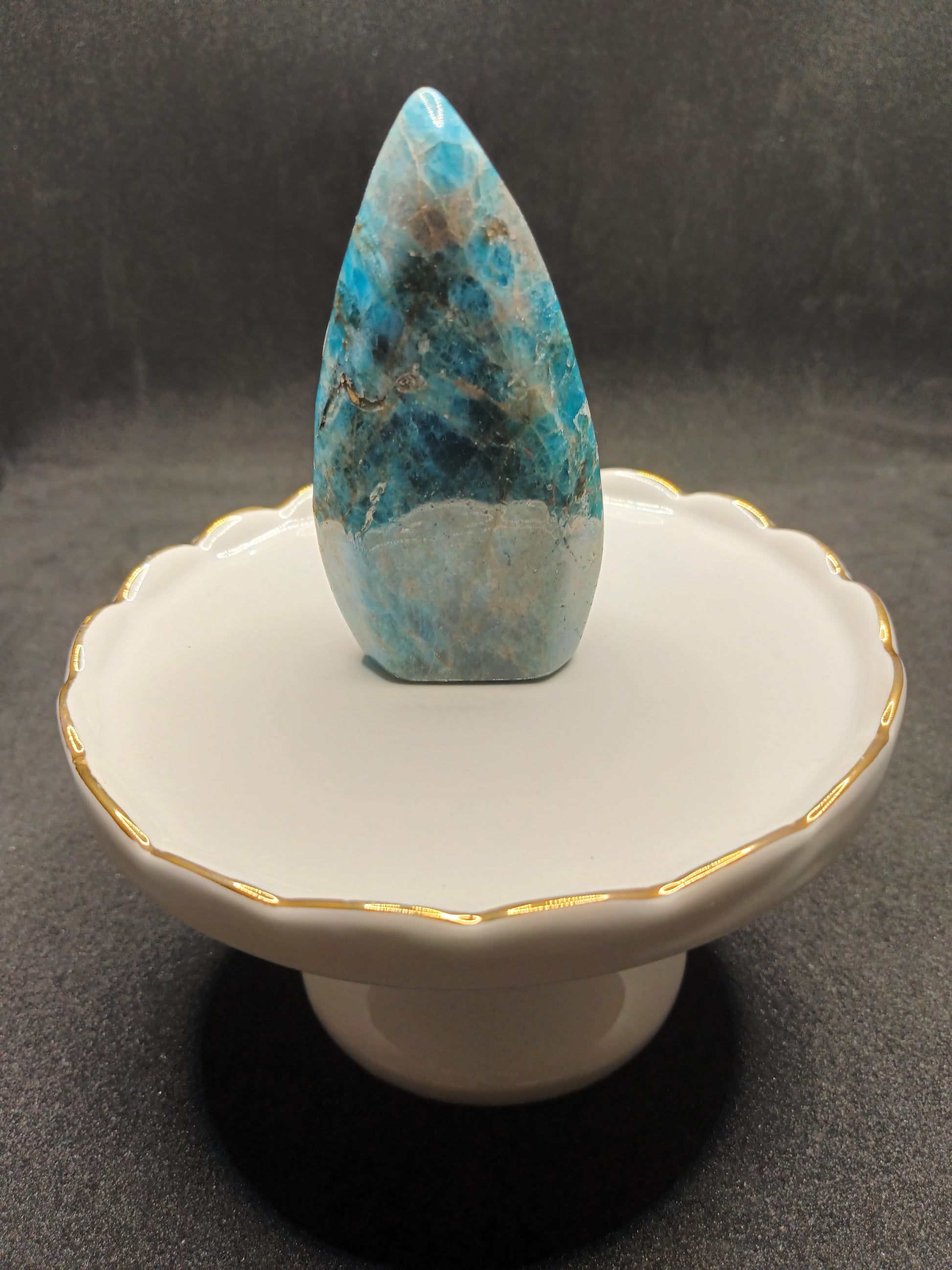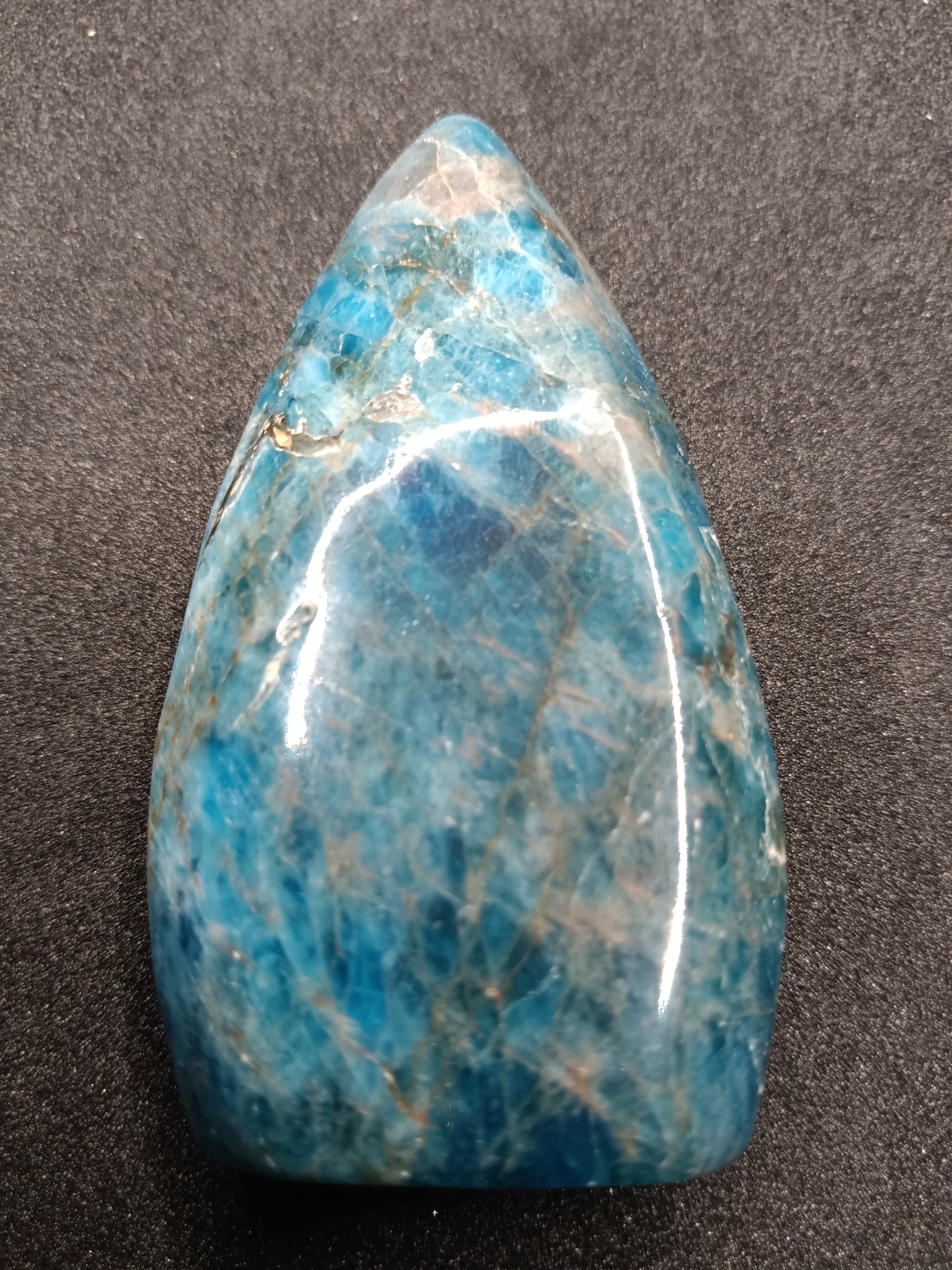 This stunning Apatite gemstone features a unique flame shape and a gorgeous color. Apatite is known for its multiple healing properties and is said to inspire creativity and promote inner peace. A must-have for any gemstone enthusiast and a perfect addition to any collection.