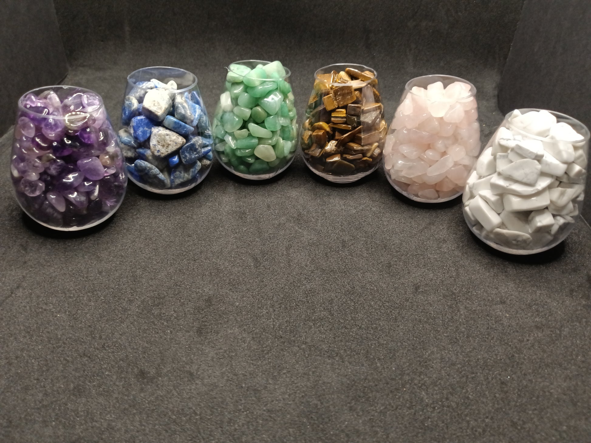 This set of Cups of Crystals provides a variety of high quality stones including Amethyst, Rose Quartz, Lapis Lazuli, Green Aventurine, Tiger's Eye, and Howlite. Perfect for crafting and setting intentions, these crystals offer a range of benefits such as promoting calmness, love, courage, and protection. Enhance your holistic practices with these beautiful little gems.