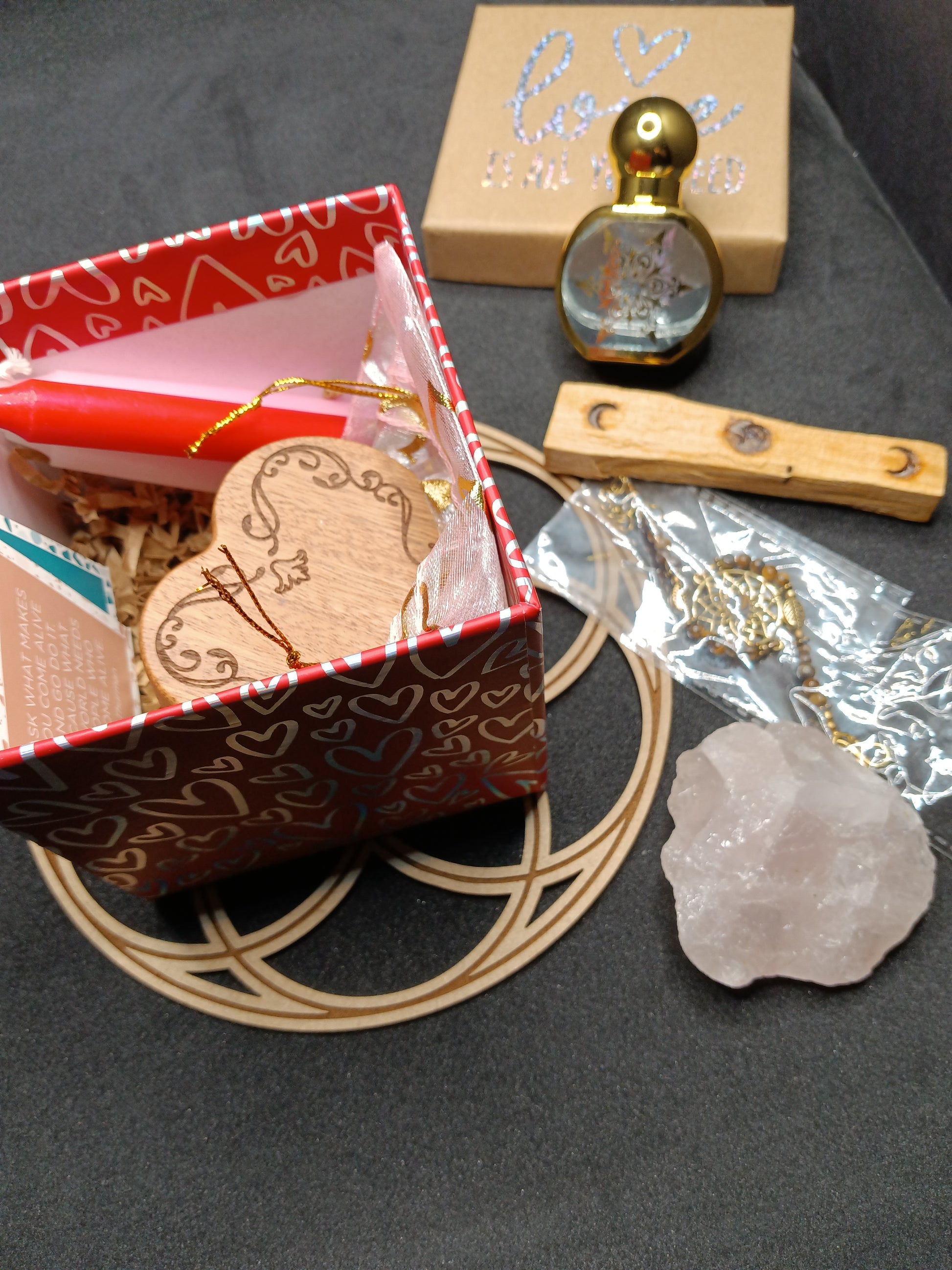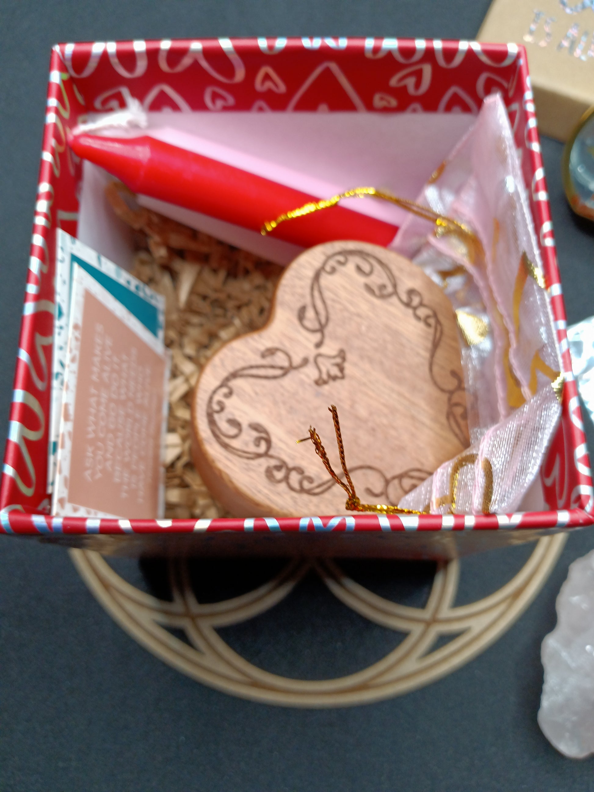 Experience true self-care with our Self Love and Care Box. Indulge in a special ritual that includes a beautiful carved wooden heart trinket box, a large rose quartz for Love, Palo Santo for clearing your space, Aromatic self love oil to enhance a feeling of well being, and candles for ambiance, reflection, and manifesting your desires. Treat yourself and prioritize your well-being with this expertly curated box